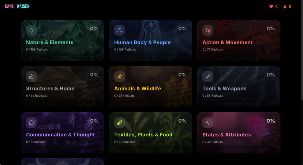 I’d love your honest feedback! Whether it’s about the UI/UX, the radical categorization system, bugs you encounter, or suggestions for improvement—all input helps make this better for learners.
